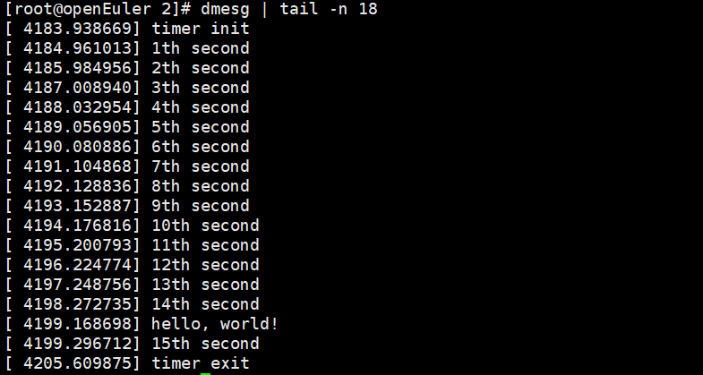 [!info] 任务描述 请你根据提示编写内核模块mod_timer,在该模块中创建定时任务timer,定时器超时回调任务设置为打印 “hello, world!”。注意:你需要将timer的初始过期时间设置为10秒并通过add_timer()添加到定时器队列中。之后通过mod_timer()立即修改定时器的过期时间为15秒。