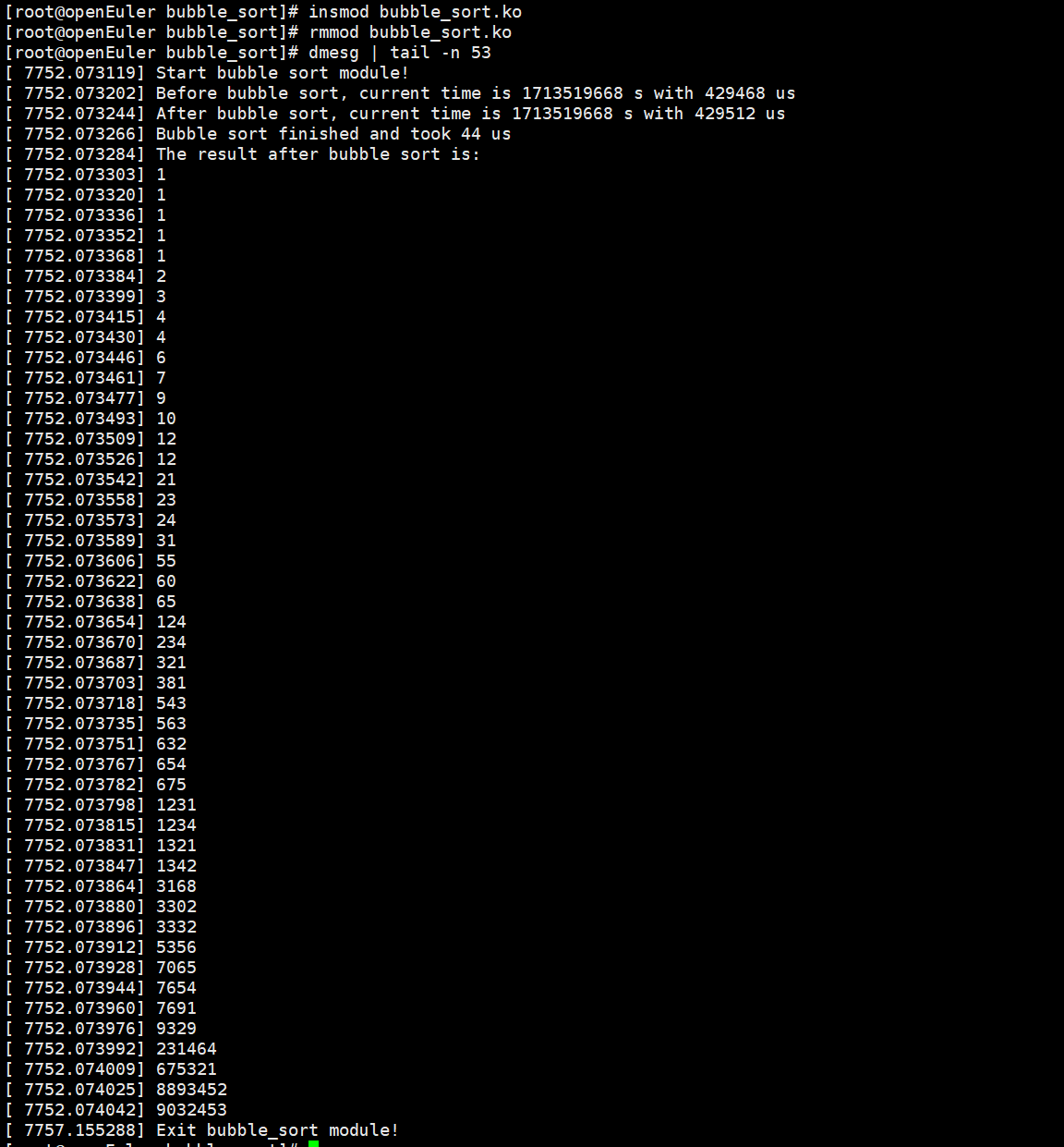 通过这次实验,我对Linux内核的时间管理机制有了更深入的理解,掌握了jiffies、HZ、tick、节拍、时钟中断等关键概念,并理解了它们与系统时钟的联系,学会了如何使用Linux内核时钟接口来计算任务的执行时间。通过比较不同排序算法的执行时间,对常用排序算法的时间性能差异有了更深入的理解。