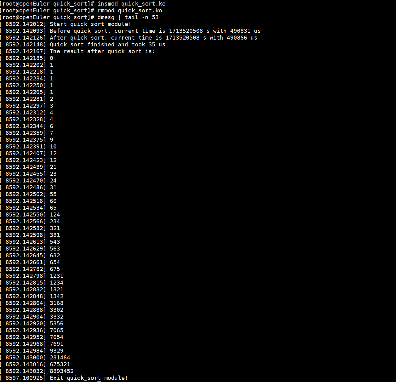 printk(KERN_INFO "Quick sort finished and took %lld us\n", time_spent);
