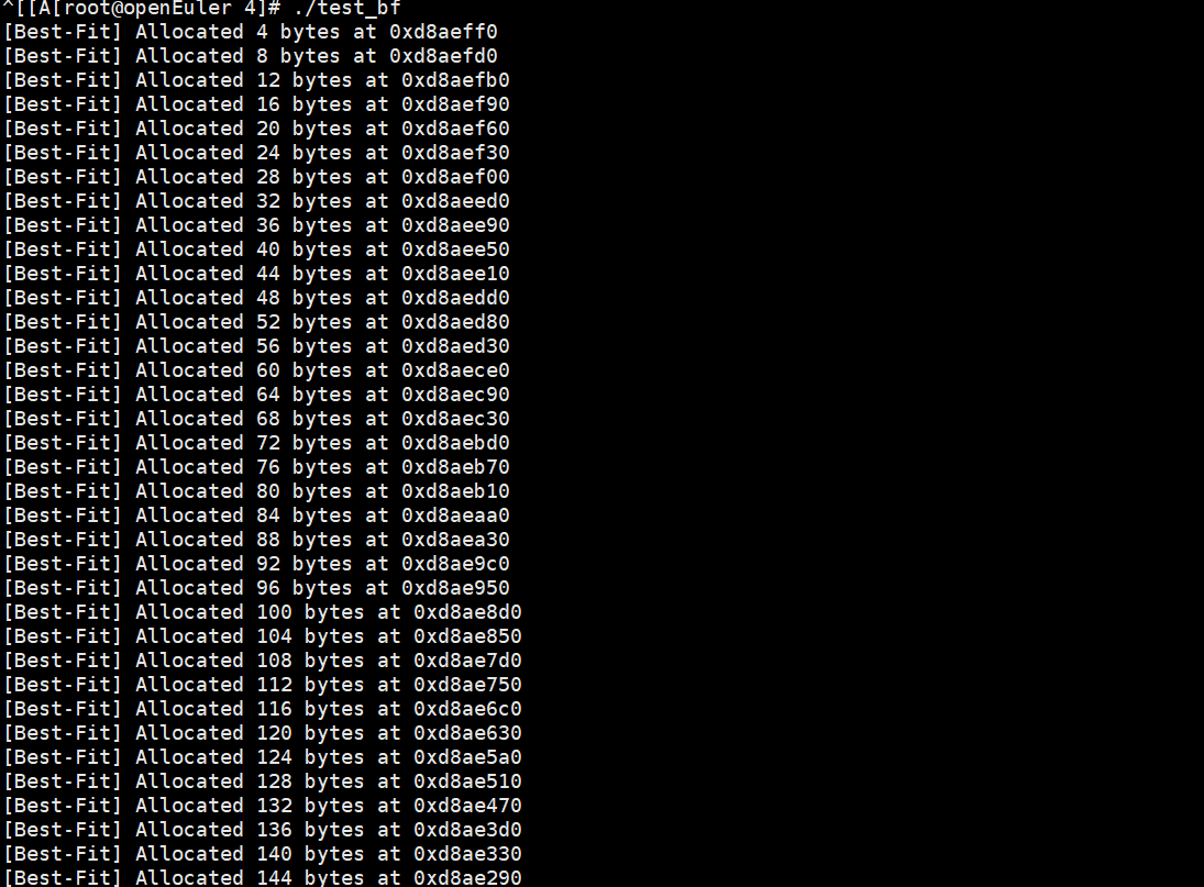 - 如果最佳适应块的大小大于需求大小,则拆分该块,将前半部分作为分配出去的内存,更新其大小,并将剩余部分保留在链表中。