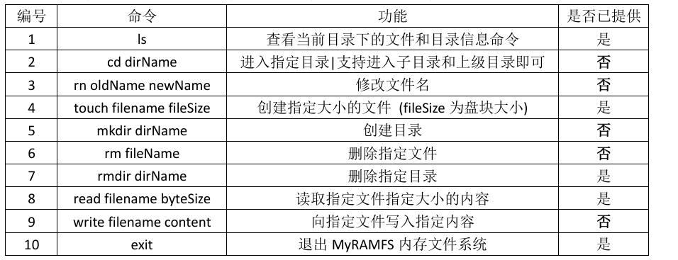 本次实验要求学生在Linux下实现一个类似于ramfs的内存文件系统myRAMFS,该文件系统至少支持下表中 描述的10条命令,其中实验手册已提供了部分命令的实现,其他命令需要大家自行实现。