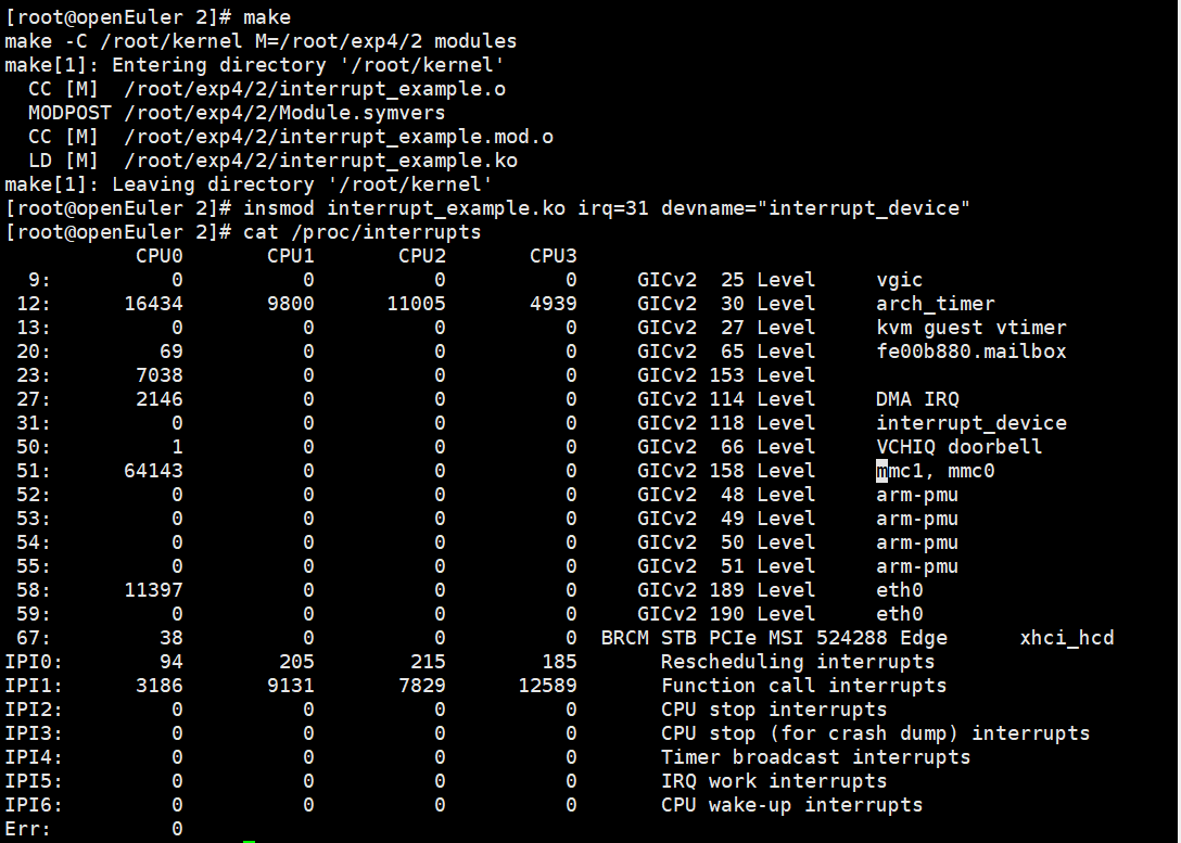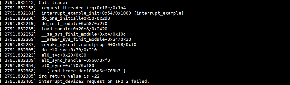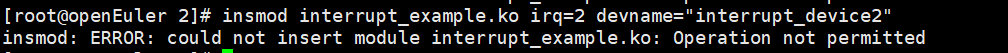 操作不被接受,可以猜测2号中断是保留中断,不能注册 在 Linux 系统中,有一些中断号是保留给特定的硬件设备或者系统使用的,而且通常不允许用户自定义的模块使用这些中断。如果尝试注册这些保留的中断,会收到类似的错误消息,指示操作不被允许。