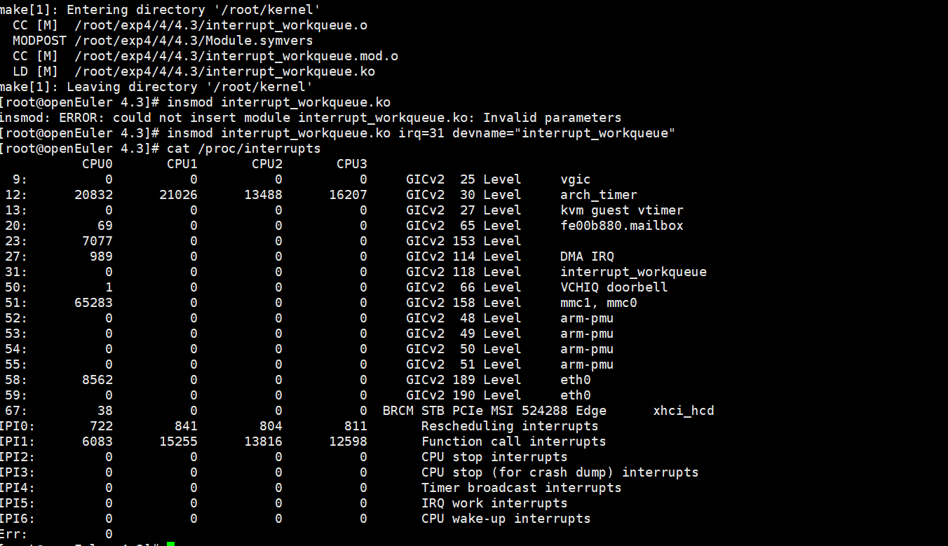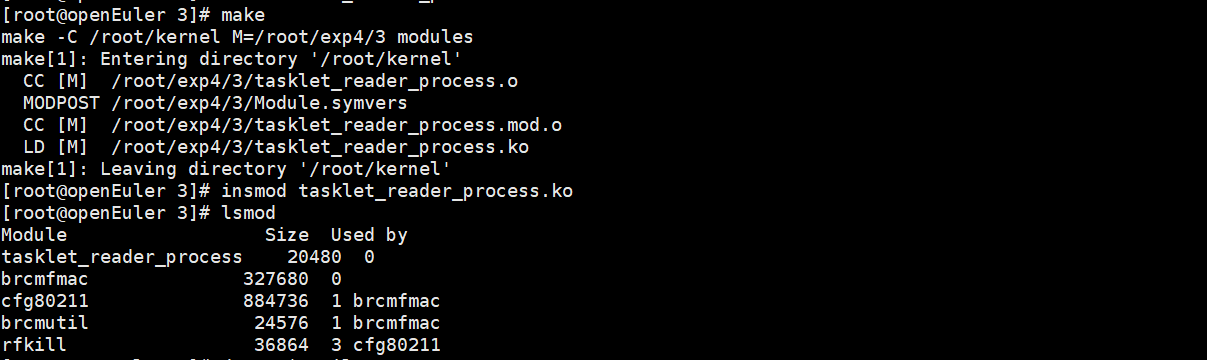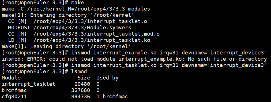 interrupt_tasklet.c 和Makefile在exp4/3/3.3目录下 执行截图如下