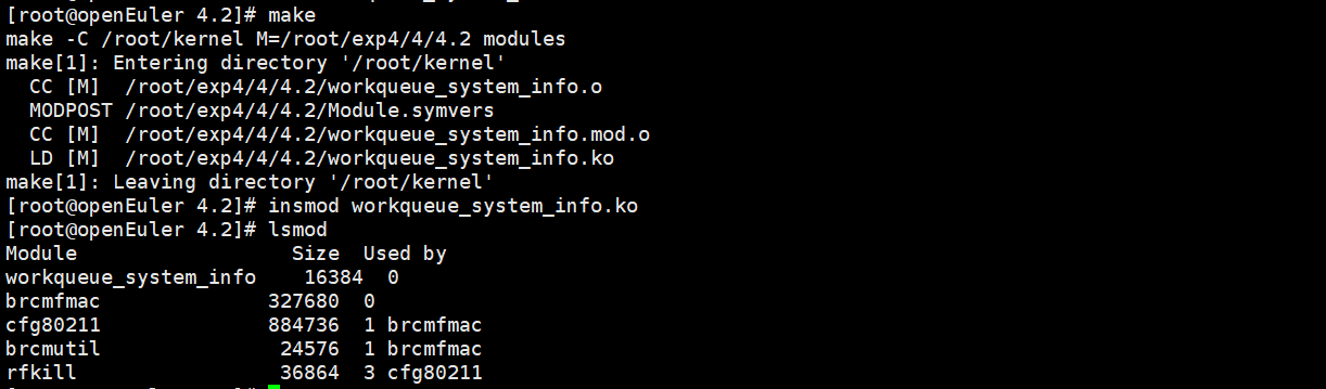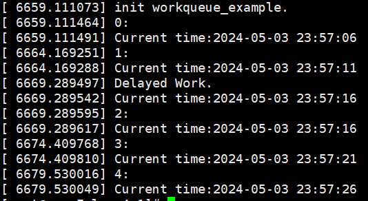 思考:请自行编写Makefile并完成内核模块的安装和卸载,查看日志,并结合代码对日志结果进行分析(tips: 结合两个任务打印的时机分析)。