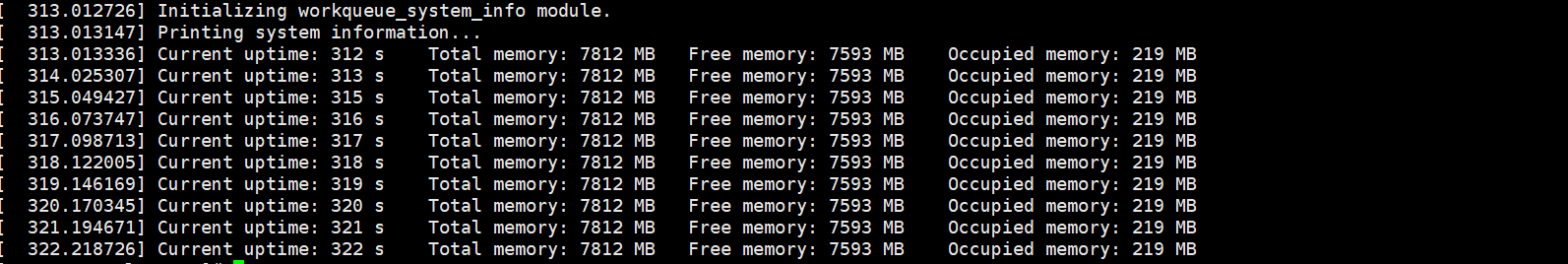 请你参考workqueue_example.c,编写内核模块workqueue_system_info,在该模块中创建一个延时任务work, 借助/proc文件系统实现每隔1s (实际打印间隔可能因为字符处理占用时间而变大) 打印一次当前系统的状 态,包括启动时间、内存使用情况,打印10次后停止打印