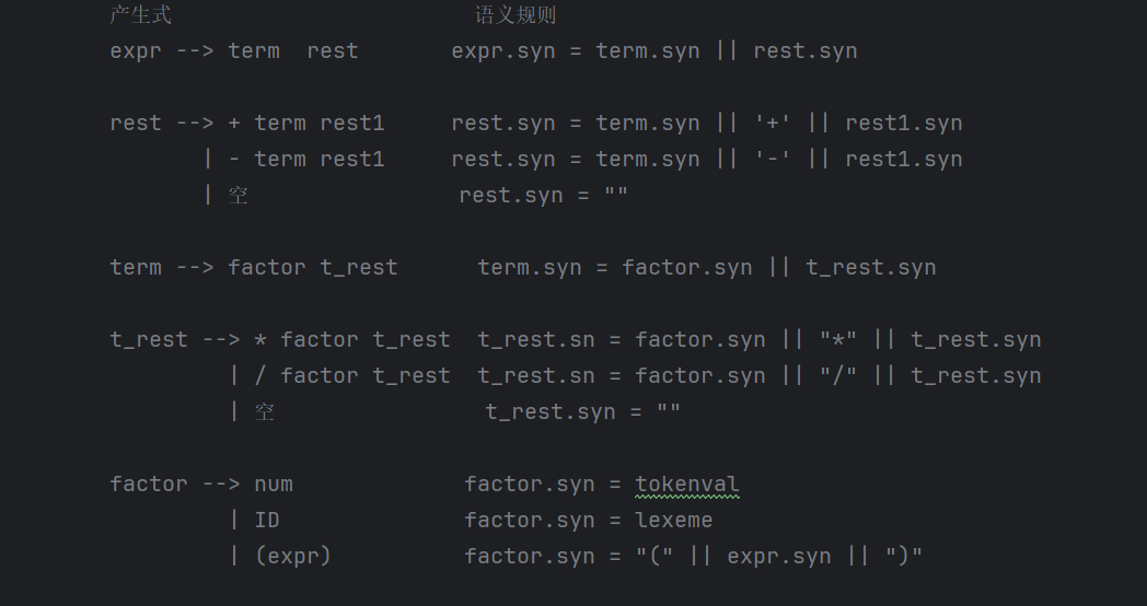 - 在原文法的基础上引入rest和t_rest,便于实现递归向下地进行翻译