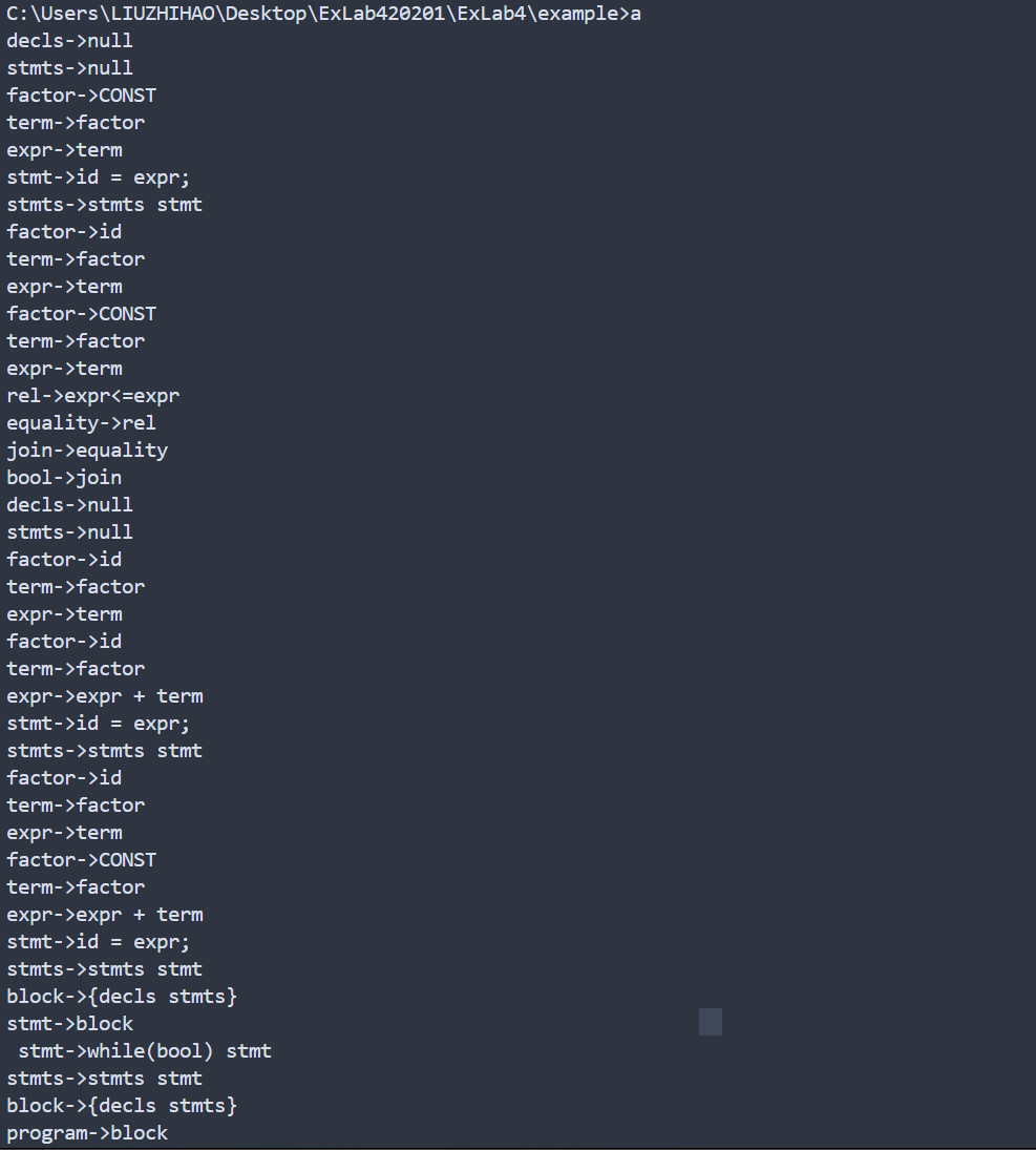 1.参考实验示例完成,提交实验报告。 2.实验的结果为:按归约的先后顺序显示每次归约时所使用的产生式。(最右推导使用产生式的逆过程)